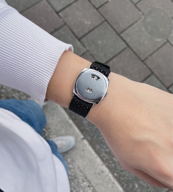此錶方中帶圓,保有最原始的金屬拉絲紋狀態不錯,作動正常但走時稍慢需要保養