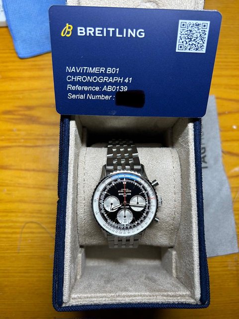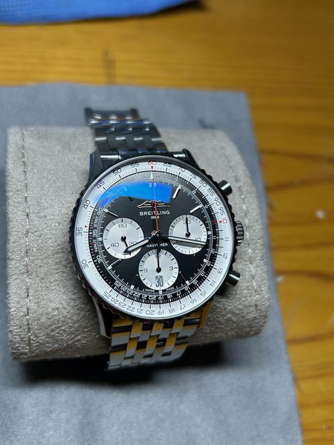 品牌名稱:Breitling Navitimer 41 手錶品名:Navitimer 41,反熊貓,鏈帶款 保卡年月:2023/08,保固至2028/08 欲售金額: NT$150,000 物品所在地:板橋 隨附物件:原廠盒裝齊全,剩餘鏈帶 物件新舊:8.5-9成新,有日常配戴痕跡,無撞傷 購買來源:王永昌 聯絡方式:站內信 其他說明:新北板車,中和環球面交