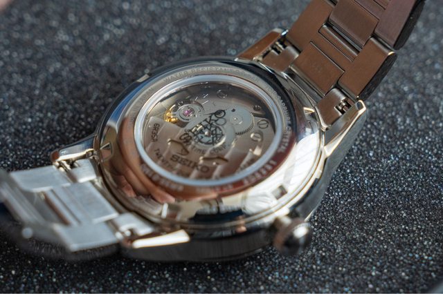 尖走小紅吉字做跳色相當畫龍點睛;夜光分佈於指針及數字時標旁小點;透明底蓋可欣賞