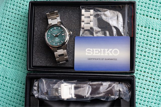 物品說明:旗艦店限定款精工登山者,猶如草地質感般的錶面,玫瑰金秒針與綠面盤相映