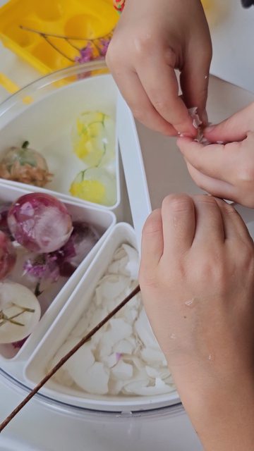 只見兄妹倆很有默契的把冰塊分類