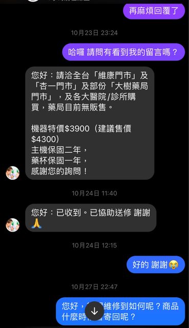 → c9103240529 : 到用不到一年壞掉需要維修的時候卻遇到這些狀況, 11/06 16:19
