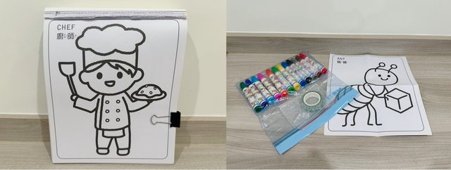 用夾鏈袋將彩色筆、塗鴉紙、紙膠帶裝成一包