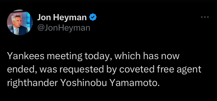 隨後SNY電視台記者Andy Martino也報導,據傳山本由伸在紐約期間,也會與紐約洋基進行