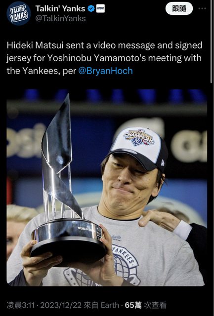 推 tc6289: 洋基:你看松井拿世界大賽MVP隔年我們就丟了 12/22 12:06