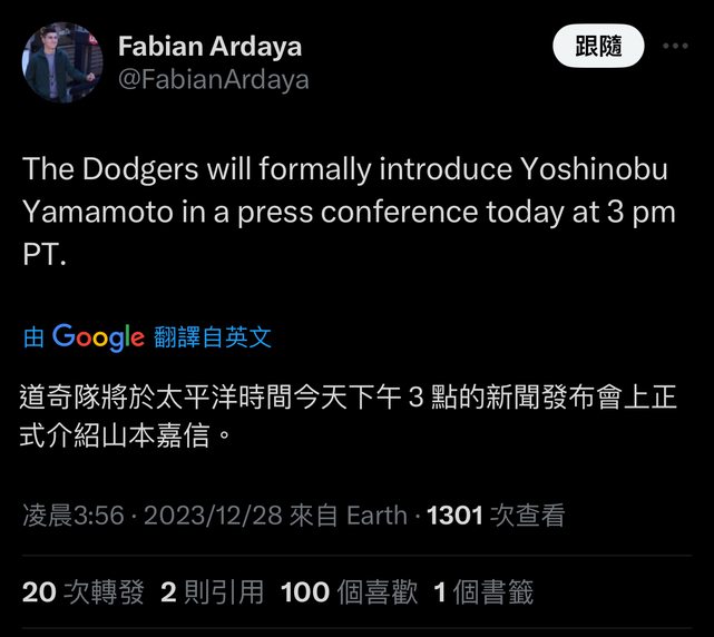 標題[分享] 道奇官宣:歡迎山本由伸