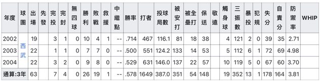 : 許銘傑在西武待了12年,生涯49W 49L,8完投5完封
