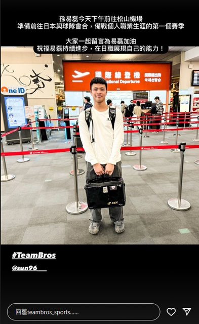 https://www.instagram.com/stories/teambros_sports/3274859837437913448/ 孫易磊今天下午前往松山機場 準備前往日本與球隊會合 備戰個人職業生涯的第一個賽季 大家一起留言為易磊加油 祝福易磊持續進步,在日職展現自己的能力! #孫易磊 sun96___ https://i.imgur.com/YZJWpSm.jpg