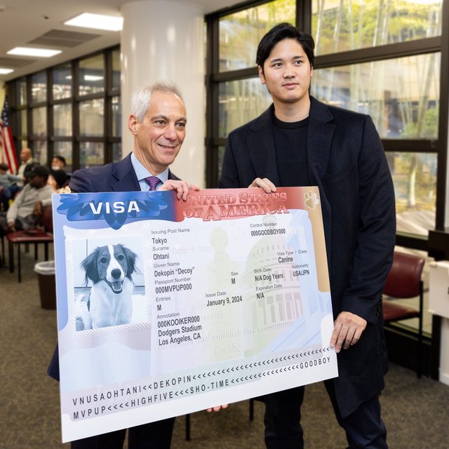 和大谷合照,並給大谷的狗狗一份美國簽證