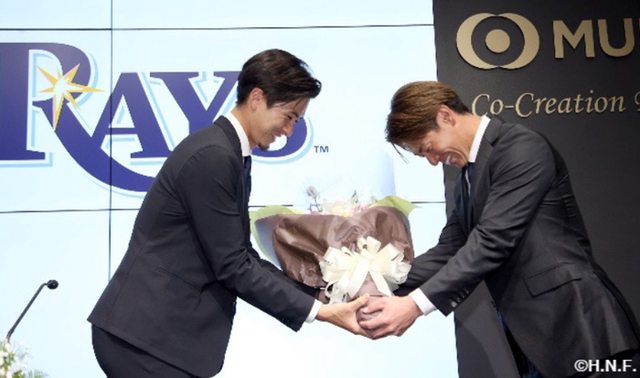 透過入札制度與美國職棒坦帕灣光芒隊簽約的上澤直之投手與栗山英樹CBO於今日在ES