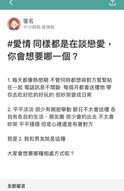 推 momomom : 最好的是每天熱戀 每天慶祝 但是不吵架的那種 謝謝 09/08 15:48