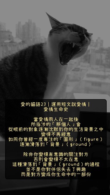 當兩人相互熟悉以後,感情在圓缺輪替幾轉之後,許多事都沈默到兩人的關係背景之中,伴侶開始轉化為一種「家人」角色的身分。我們對伴侶已經很熟悉了,容易變得不經意,容易不把對方視為關注的對象,但是生活中的許多事項實際上已經密密麻麻地牽扯在一起,比如有共同的朋友及社交圈;生活的各種習慣之磨合; 等。