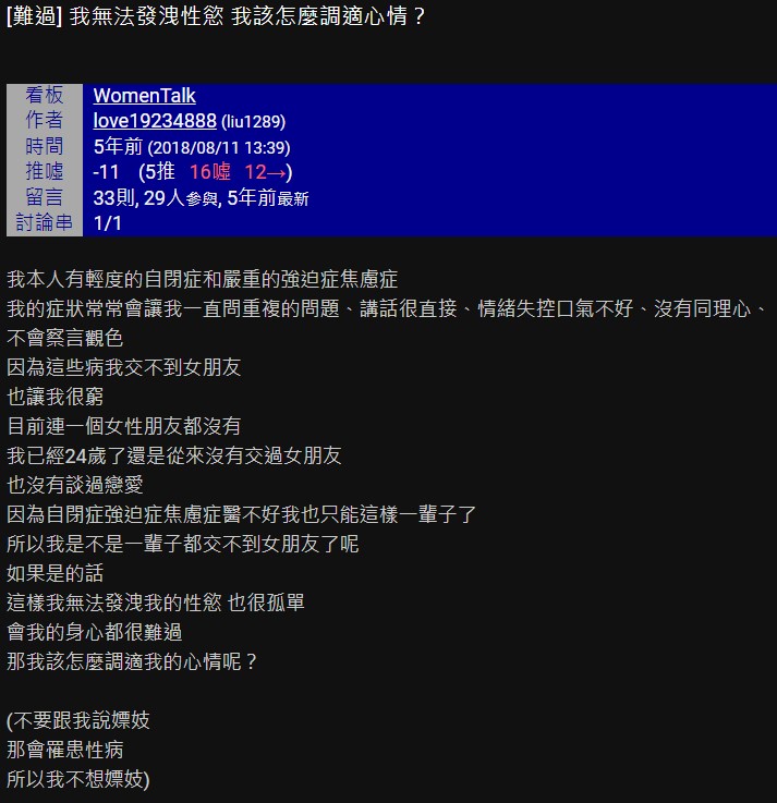 推 angels999 : 你自己反過來想,有躁鬱症自閉症強迫症的女生你要嗎05/23 11:16