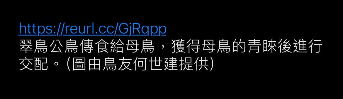 般,母鳥接受後,便進行交配,共築愛巢繁洐下一代。