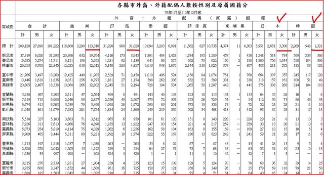 : 台灣女性嫁外配多出近十倍,而且在每一個外配國籍都勝出。甚至連娶日韓妻也是台男勝
