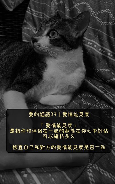 「愛的貓語」是根據心理師近30年的觀察、實務經驗及愛情心理學的研究成果,發展而成的短文,我認為,如果能從01貓語,細細思量貓語,有這個認知及行為,往向順利和諧的戀人乃至於可能未來婚姻之幸福不遠矣!