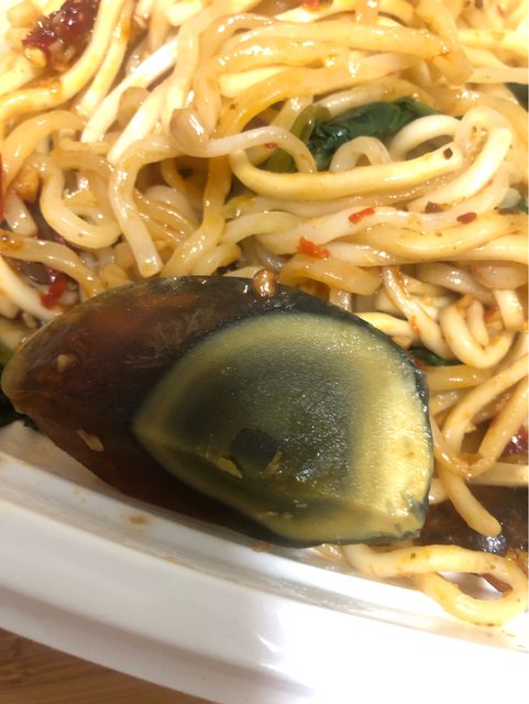 賣相100分,辣拌麵100分,皮蛋份量100分,皮蛋口味,倒扣100(所以只給75分)