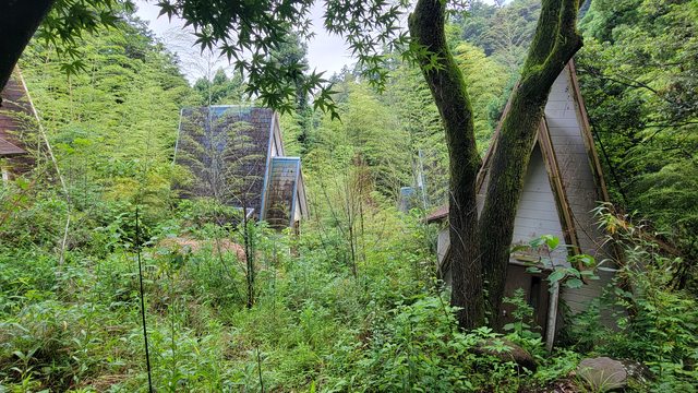 路旁有幾棟埋沒在樹林中的歐風小木屋,很有廢墟的敗亡感