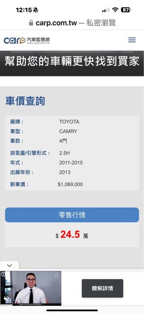 其他說明:查詢了汽車鑑價網,車子售價為24.5萬,知道自己的車子改過色等問題,所以