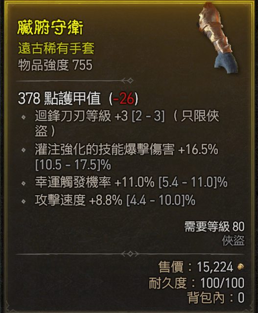 標題[競標] D4 S1 俠盜 迴鋒三 頂幸運 攻速 手套