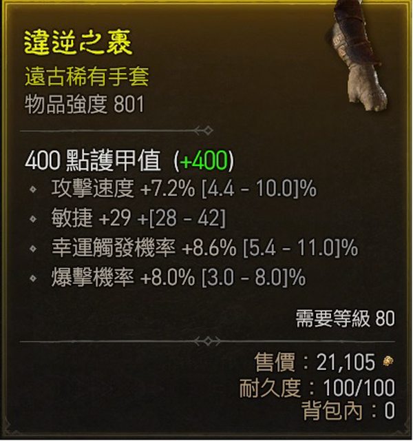 物 品:遠古稀有手套 頂爆率 高幸運 攻速 敏捷