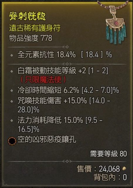 物 品:魔法使白霜被動+2 CDR 6.2% 減耗15% 咒喚技能傷害15%