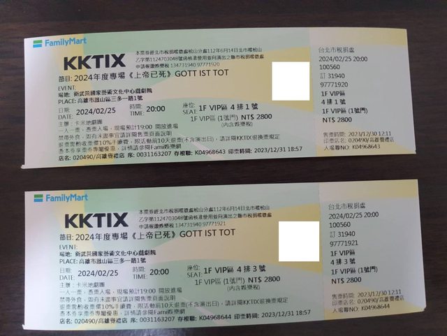 標題[售票] 2/25 JIM 上帝已死VIP 高雄 2800*2