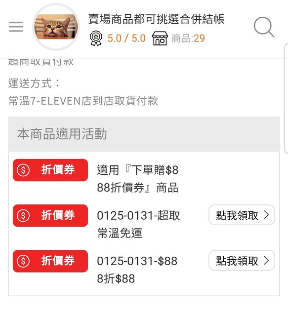 使用7-11 OP會員結帳前領取全站折價券及免運券(折價券使用期限01/25至01/31)