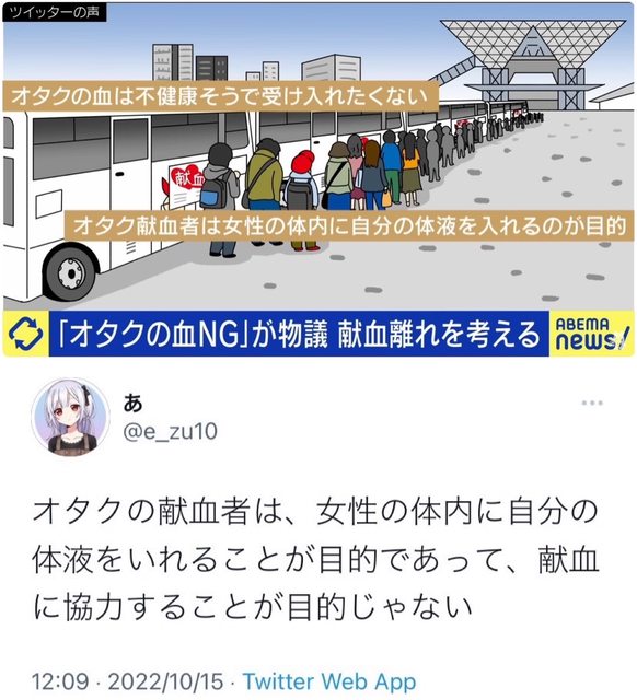 : 表示阿宅捐血是為了讓自己的血液能侵犯女權