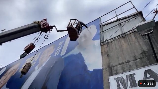 : 葉元之17日在新北市板橋區縣民大道與館前西路口懸掛他與侯友宜、柯文哲合體的大型競