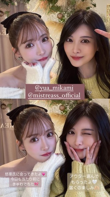 照片,相澤南驚喜現身現場,她穿著鵝黃色毛衣,親密地依偎在好友三上悠亞身