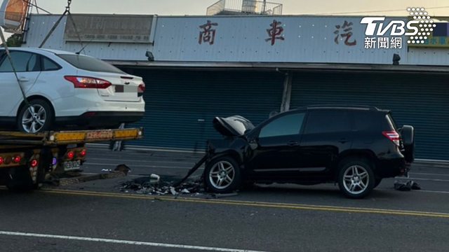中正路內側快車道,與陳姓男子駕駛的黑色轎車對撞,撞擊力道之大,使兩人一度受困車