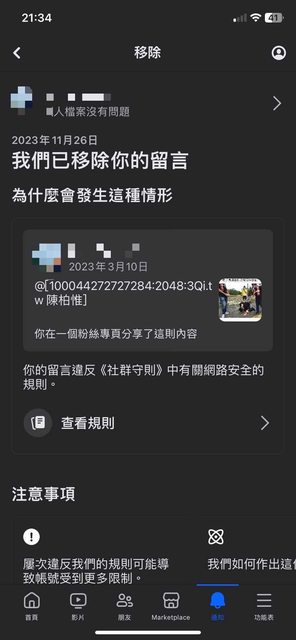 怎麼昨天晚上看到臉書跳出一個違反規定刪除留言的通知