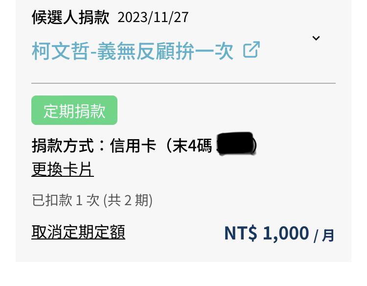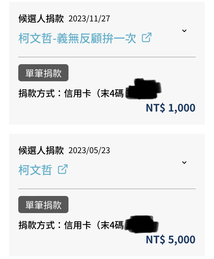 → visviva: 應該是捐柯文哲的大選募款那邊 112.104.20.48 11/27 22:32