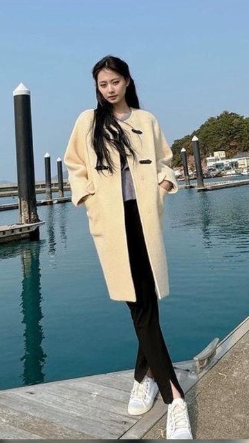 子瑜留起長捲髮,搭配米白色長版大衣,和簡單黑褲及白鞋,整體看起來更加成熟穩重,突