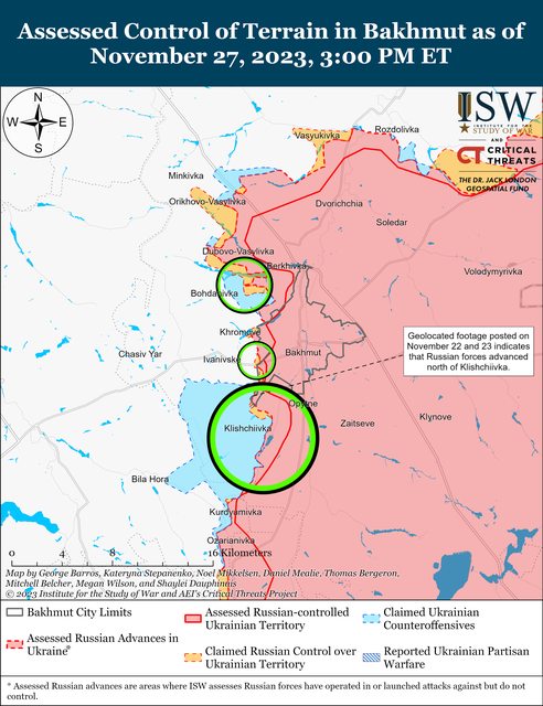 11月27日,俄羅斯軍隊繼續在頓內茨克市西部和西南部發動進攻,但沒有任何確認的進展。
