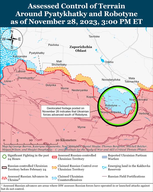 11月28日,俄羅斯軍隊繼續對扎波羅熱州西部進行地面攻擊,但沒有任何確認的進展。
