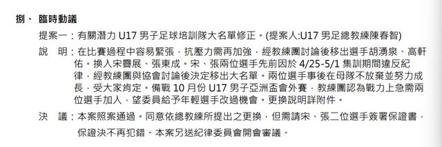 U17男足國家隊總教練陳春智在會議中提出「臨時動議」