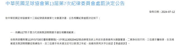 經過體育署函文及足協紀律委員會決議,在7月間公告「懲處退訓」