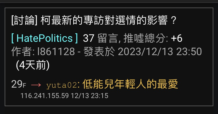 → s7503228: 家有小孩的年輕家長就說好 柯粉就一直幹 60.249.132.75 12/18 09:01