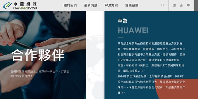 當中的廠商永鑫能源就把中國華為列在合作夥伴呢