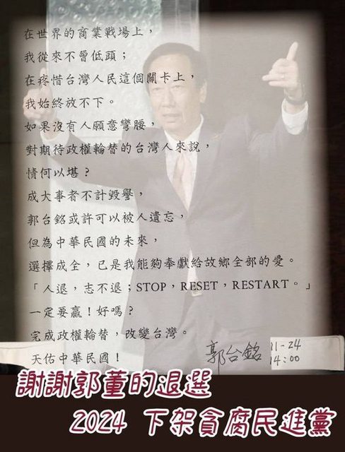 郭董是一位令人敬佩的領袖,他追求改變與希望,奉獻全力為國家政策努力。雖已退選,