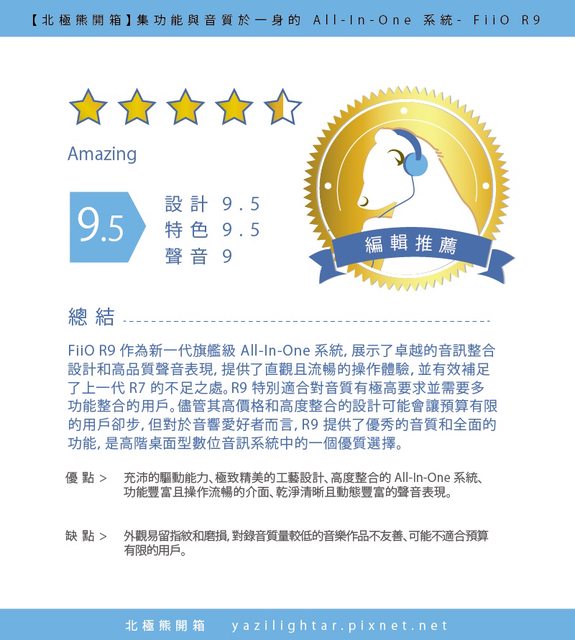 就個人而言,R9 幾乎就是本熊心目中完美的音訊整合中心。接下來,本熊將與大家分享