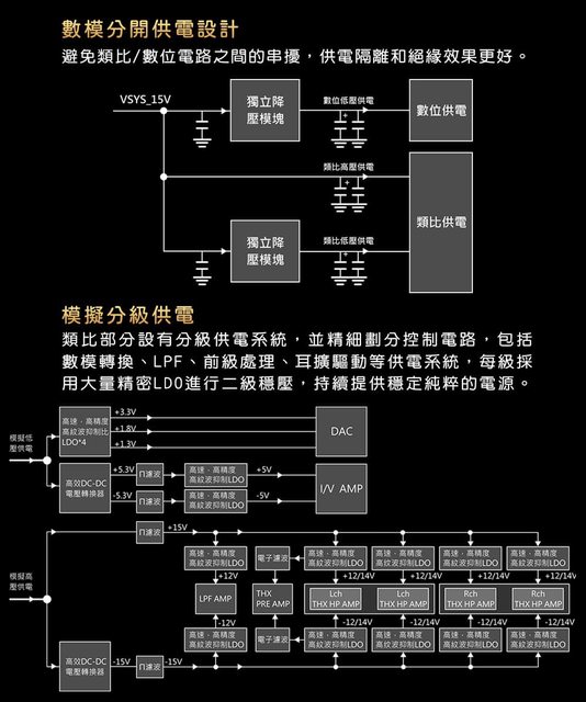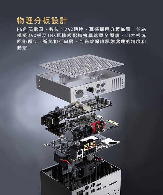 ● 內部電源、數位、DAC轉換、耳擴採用分板佈局,類比 DAC板及THX耳擴板配備金屬遮