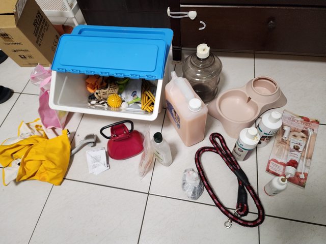 物品項目:梳毛刷,指甲剪,洗毛精數罐,中型犬雨衣,牽繩,整理箱,,牙刷牙膏,玩