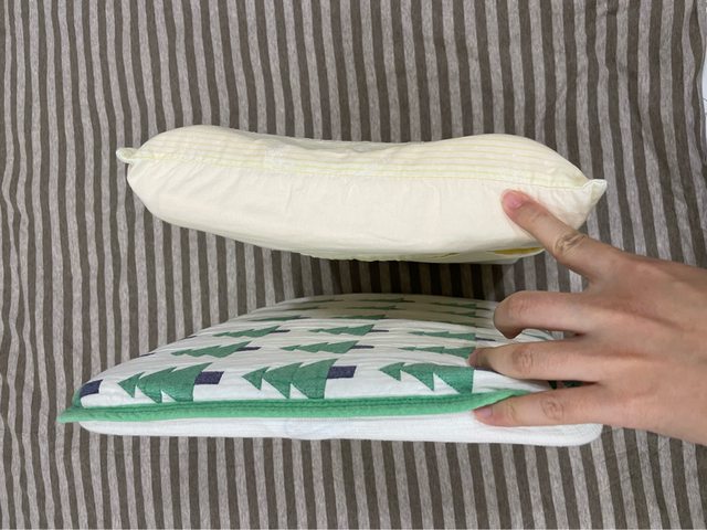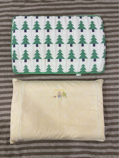 兒童乳膠枕2個,一個扁平(黃枕套)適合小小孩、另一個稍高一些(聖誕樹枕套)適合