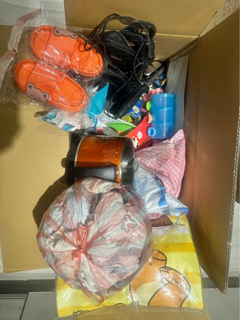 物品項目:多項雜物(兒童球鞋 拖鞋 衣服毛巾、快煮壺、後背包、電棒捲、兒童玩具、
