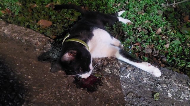 下班路過看到賓士貓貓被路殺了,看起來是被移動到草皮的。