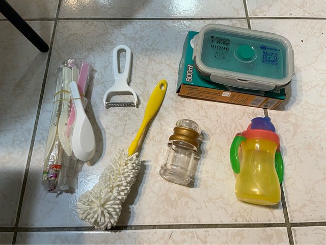 4.免洗湯匙筷子刀子、折疊保鮮盒、瓶刷、胡椒罐(關不緊)、兒童水杯