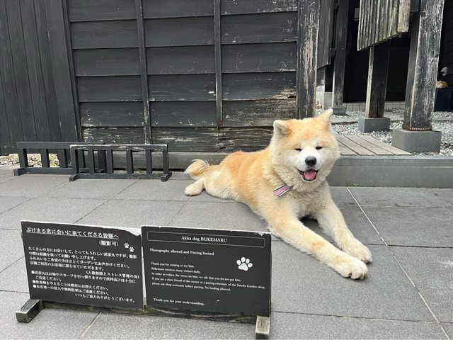 四處逛逛,悠閒的氛圍,連秋田犬也靜靜趴著。河邊的風景,想必春、秋季到訪一定更美